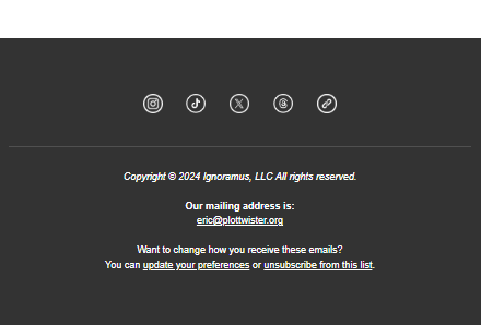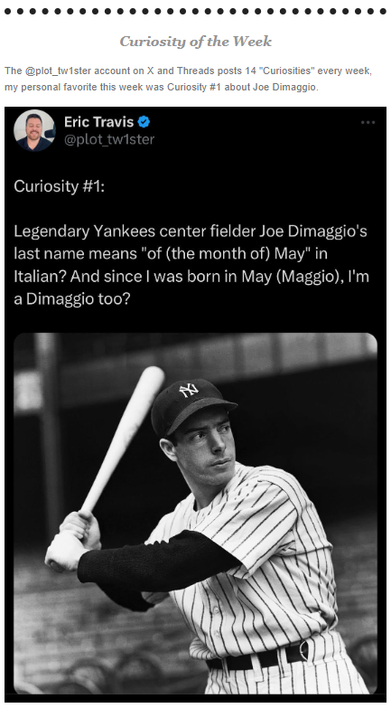 The weekly Plot Twister newsletter contain Eric’s Brain Storms, Plot Twisters of the Week, Curiosities of the Week, recommendations, special offers, and news. Enjoy!